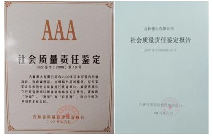 按照《吉林省社會(huì)質(zhì)量責(zé)任優(yōu)秀單位鑒定規(guī)則》規(guī)定,由企劃部申報(bào)的分割雞肉、雞肉調(diào)理品、火腿腸產(chǎn)品,于2009年8月順利通過專家鑒定,獲吉林省社會(huì)質(zhì)量責(zé)任AAA優(yōu)秀單位稱號(hào)。