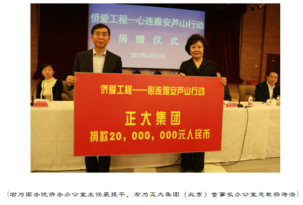 2013年4月20日8時02分,四川省雅安市蘆山縣發(fā)生7.0級地震。消息傳來,舉國震動。中國人民心連心,一方有難八方支援,全國人民與雅安人民站在一起。社會各界紛紛伸出了援助之手,對災(zāi)區(qū)進(jìn)行了各種形式的捐助、支持與幫助。4月23日,正大集團(tuán)為雅安地震災(zāi)區(qū)捐款人民幣2000萬元,集團(tuán)(北京)董事長辦公室楊海浩總裁代表集團(tuán)出席國務(wù)院僑辦舉行的“僑愛工程——心連雅安蘆山”行動捐贈儀式。
